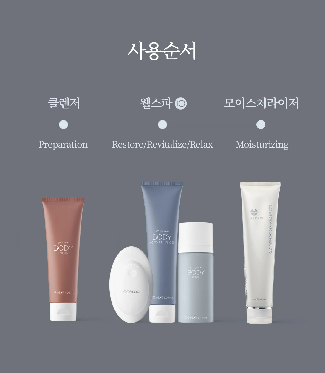 - 아침 또는 저녁, 트리트먼트를 원하는 부위에 적당량을 펴 바른후, 에이지락 웰스파 아이오 디바이스로 부드럽게 트리트먼트 합니다. 트리트먼트 종료 후 피부에 남아 있는 바디 세럼은 가볍게 문질러 흡수시켜 줍니다. 보다 자세한 사용방법은 에이지락 웰스파 아이오에 동봉된 사용설명서를 참조하시기 바랍니다.